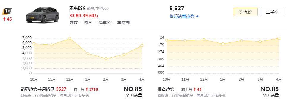 目前,蔚來旗下在售的車型有ES8、ES6、ES7、EC6、EC7、ET7、ET5、ET5T等,涵蓋了中大型SUV、中型SUV、中型車、中大型車,售價都在30萬元以上,矛頭對準了BBA等傳統豪華品牌,其中蔚來ES6的4月銷量最高,為5527輛。不過對標歸對標,如今蔚來的市場表現卻被問界和理想反壓一頭。