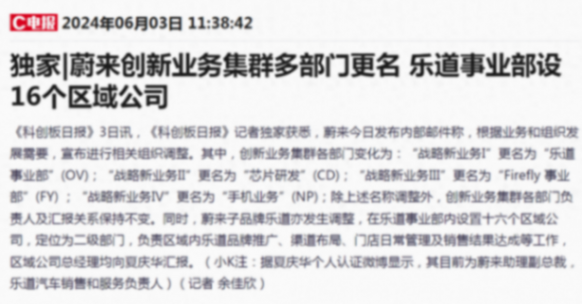 此外,蔚來汽車也對其旗下子品牌樂道汽車進行了調整,包括在樂道事業部內設置十六個區域公司,定位二級部門,負責樂道品牌的推廣、渠道布局、門店日常管理和銷售結果達成等工作,區域公司總經理都向夏慶華匯報。