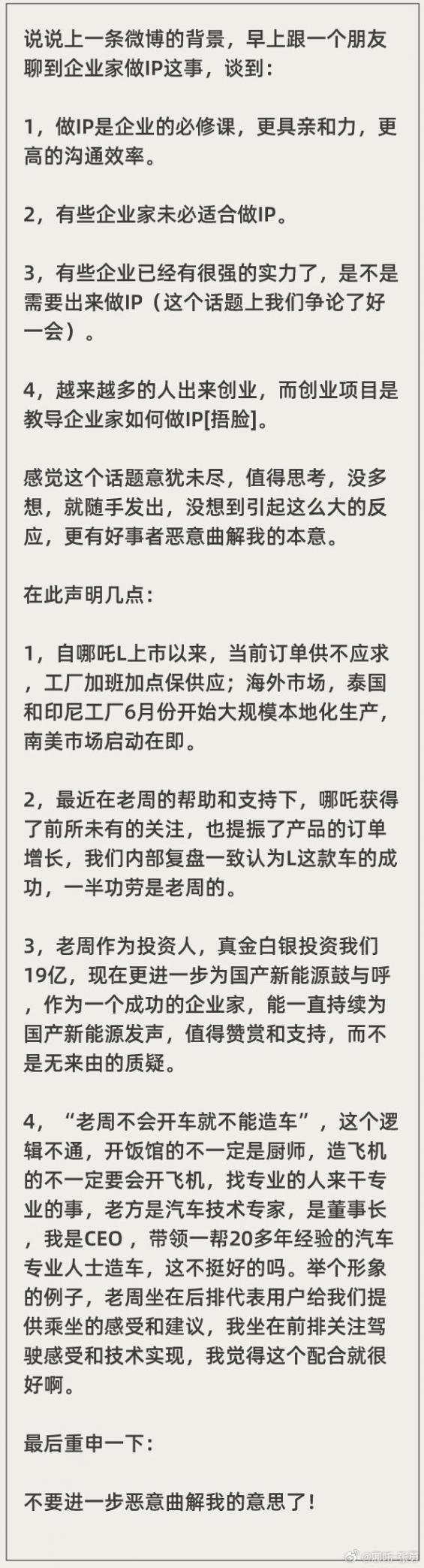 6 月 4 日消息,哪吒汽車(chē) CEO 張勇今日發(fā)文,對(duì)此前談及企業(yè)家做 IP 的話(huà)題進(jìn)行了解釋和說(shuō)明。