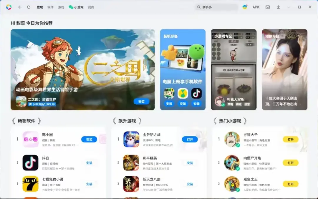 不得不說,騰訊這次可是“下足了功夫”。應用寶不僅實現(xiàn)了Windows上的WSA技術(shù),還集成了主流的1000個APP,像微信、美團、小紅書這些熱門應用都有。 更厲害的是,它還支持iOS區(qū)游戲,比如和平精英、王者榮耀等,這可真是“一舉兩得”啊!