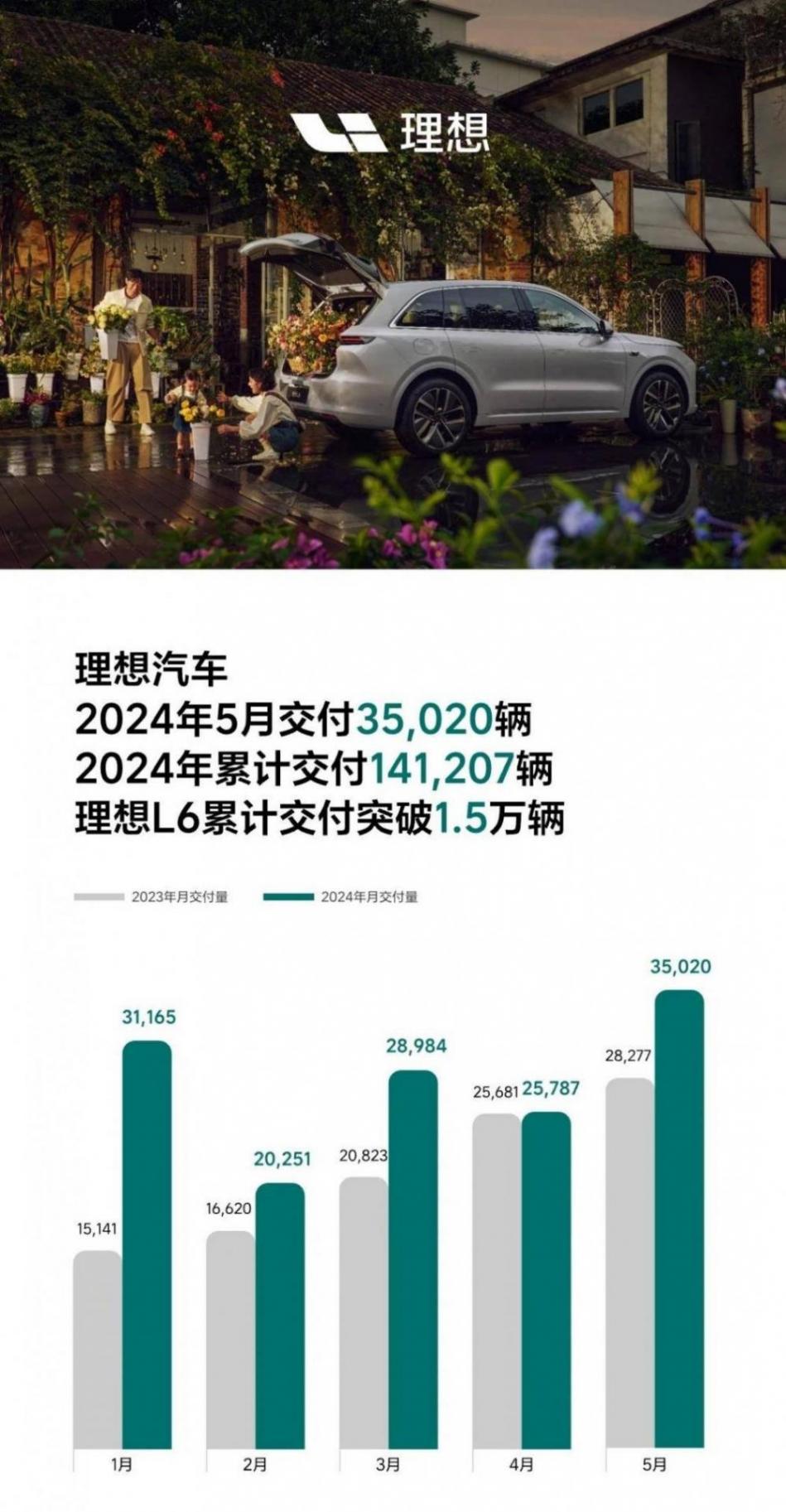 6月1日,理想汽車公布2024年5月銷量數(shù)據(jù)。根據(jù)數(shù)據(jù)顯示,理想汽車5月份共交付新車35020輛,同比增長23.8%。截至5月31日,理想汽車累計交付774571輛。今年1-5月份,理想汽車共交付新車141207輛。