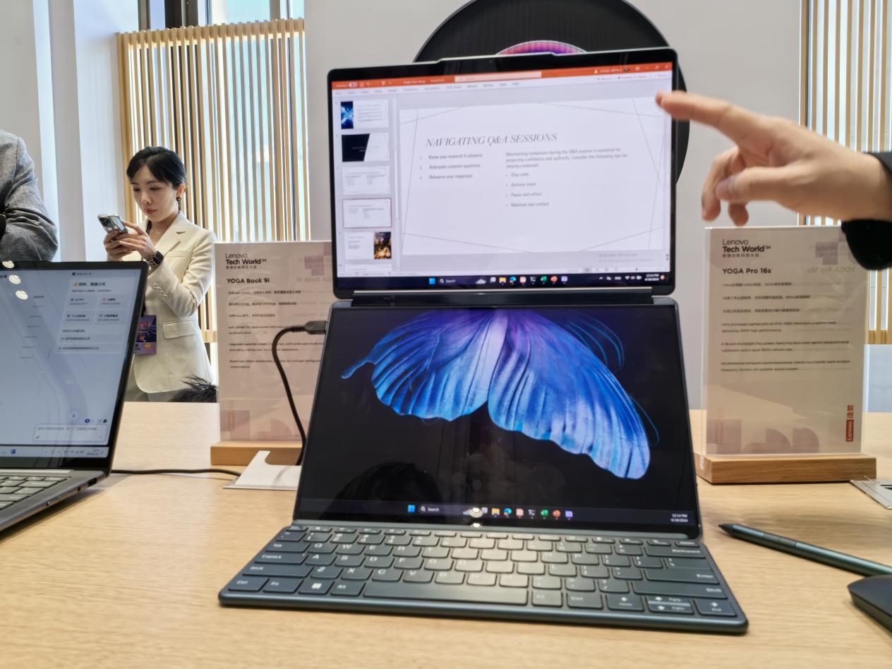Yoga Book 9i之所以能成為主推款,不僅是因為它滿足了聯想AI PC的五大特征,還是首款全尺寸可翻轉雙OLED屏筆記本電腦,雙觸控、雙手寫,分屏辦公,虛擬鍵盤,完全打破了PC的固有形態。