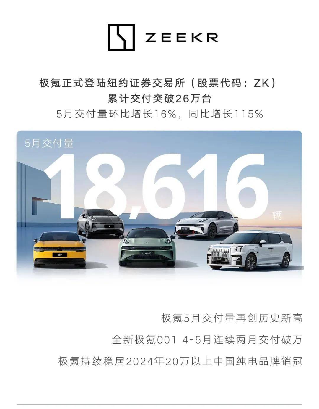 領克則憑借EM-P家族的強勢發力,取得了21,778輛的成績,新能源銷量占比約57%,創歷史新高。而極氪更是再創交付量歷史新高,5月交付18,616輛,其中極氪001在4、5月份連續兩月交付破萬。