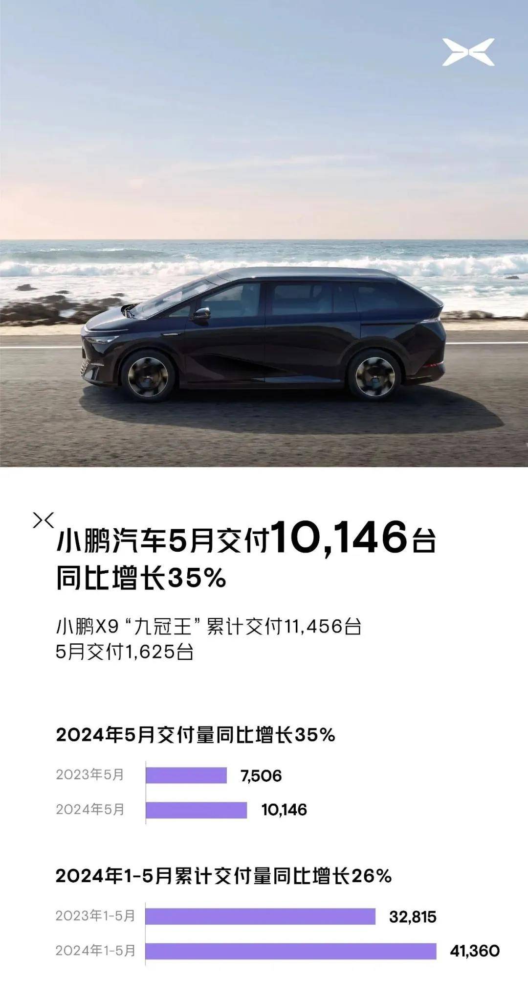 其中,小鵬X9交付1,625臺,上市五月累計交付11,456臺。2024年1-5月,小鵬汽車累計交付新車共41,360臺,同比增長26%。與自己相比較,小鵬汽車的銷量正在持續提升。