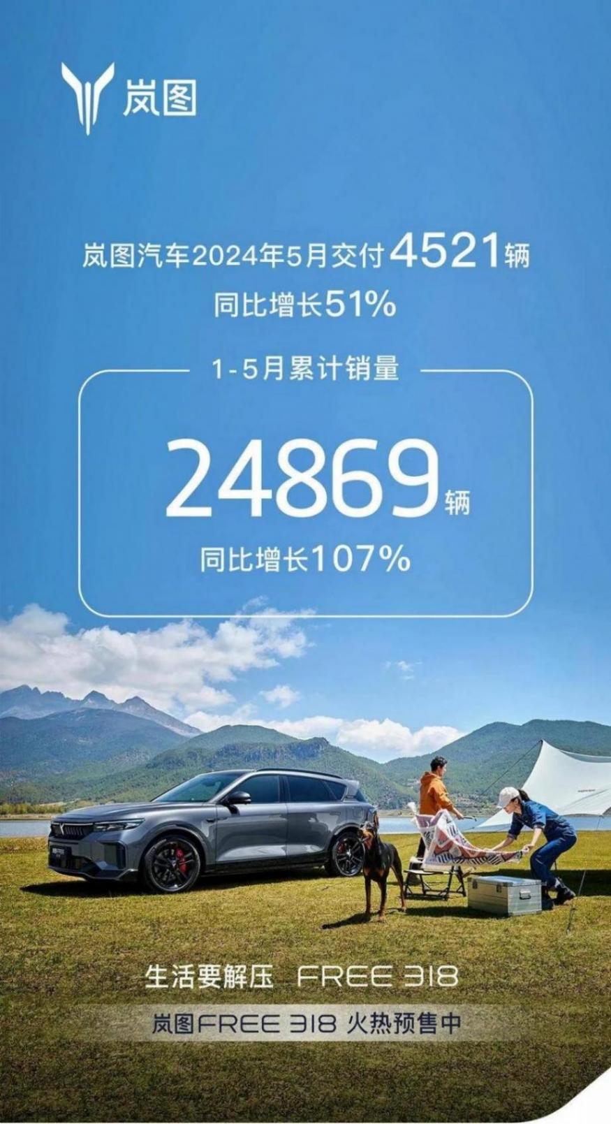 1-5月份,嵐圖汽車累計銷量達24,869輛,同比增長107%。可以看出今年嵐圖汽車的勢頭變得越來越好,新款的嵐圖FREE 318也正在預售中,過段時間嵐圖汽車還將推出嵐圖知音等新車型,期待它們正式上市后的表現。