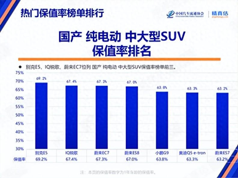 同時,蔚來三款車型EC7、ES8、ES7的保值率均在60%以上;其中,蔚來EC7、ES8分別以67.3%、67%的成績,成為大型純電SUV中最保值的中國品牌車型。