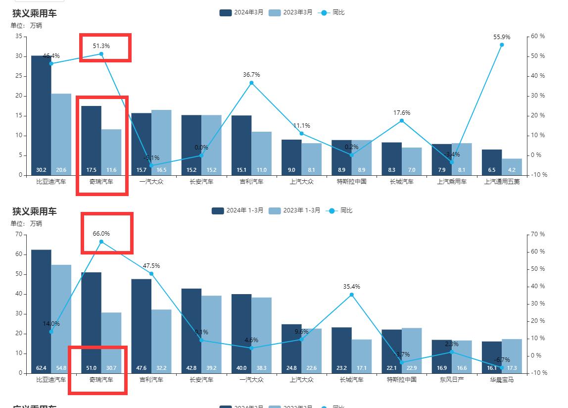 當然,奇瑞宣傳是一方面的短板,但不要就此覺得奇瑞就是菜雞,事實上的奇瑞銷量依然是非常好的,從這張圖就能看出來的,奇瑞在3月份的銷量達到了17.5萬輛,占比打斗了51.3%,居然超過了比亞迪的成績,而整個第一季度里面,奇瑞更是把比亞迪撇到一邊去了,一路高歌猛進,達到了51萬輛,占比達到了66%,足以說明他們有多厲害了。