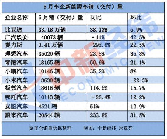近日,中國新能源車企陸續公布5月份銷量。從數據來看,除廣汽埃安和哪吒汽車外,大部分車企銷量同環比普遍回暖。