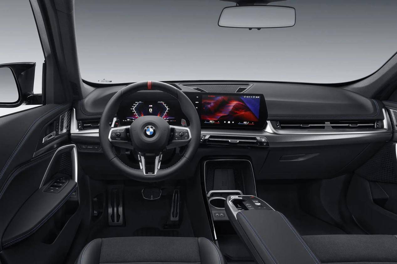 內飾部分跟普通版的X1在造型設計上沒啥區別,這套內飾是如此的簡單粗暴,沒什么設計美感,提供雙聯屏和三輻式多功能方向盤,馬鞍區斷開式設計,分成上下兩層,提供小撥片換擋,材質用料上比普通版X1有區別,座椅等位置用上了Alcantara與皮革拼接的材質,主要還是強化運動氛圍。