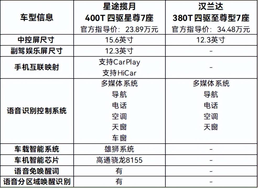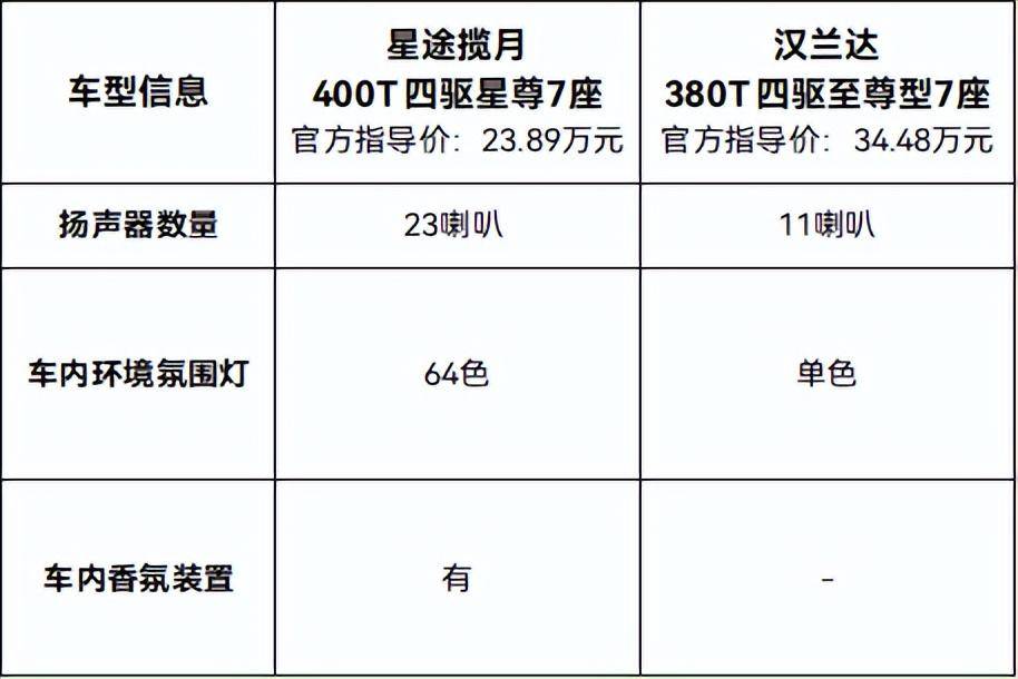 此外,星途攬?jiān)麓钶dLion Melody 音效系統(tǒng),有23顆揚(yáng)聲器,遠(yuǎn)高于漢蘭達(dá)的11顆揚(yáng)聲器;車內(nèi)氛圍燈、香氛等小細(xì)節(jié)都比漢蘭達(dá)更加優(yōu)秀,為用戶美好的自駕游營(yíng)造更加歡樂(lè)輕松的氛圍。