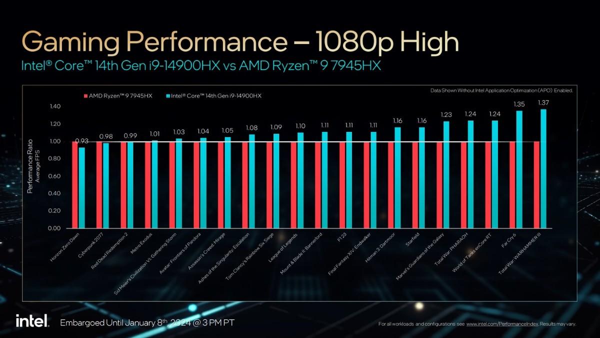 那么,在性能方面,全新14代移動處理器(酷睿HX系列)能給我們帶來哪些驚喜呢?從英特爾提供的官方資料來看,相較于“友商”的高端處理器,以i9-14900HX為代表的全新一代旗艦,無論在絕大多數游戲,或是絕大多數的創設項目中,都有著極大的優勢,僅在部分項目中略低于對手。而在優勢項目中,英特爾領先對方從5%~50%不等。這一方面歸結于優秀的內構設計,更高的頻率及效能;另一方面也歸結于英特爾處理器與操作系統,應用軟件,游戲,創設工具之間更好的匹配與優化。