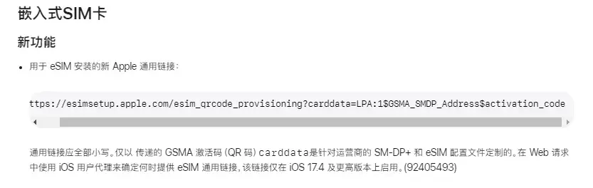 從更新包描述內容來看,并沒有告訴我們更新什么,從發行說明中可見,告訴我們一個新功能,針對嵌入式SIM卡新增一個新的安裝方法,提供了一個新的安裝鏈接,可能帶有 eSIM 二維碼的卡數據到新iPhone上安裝。