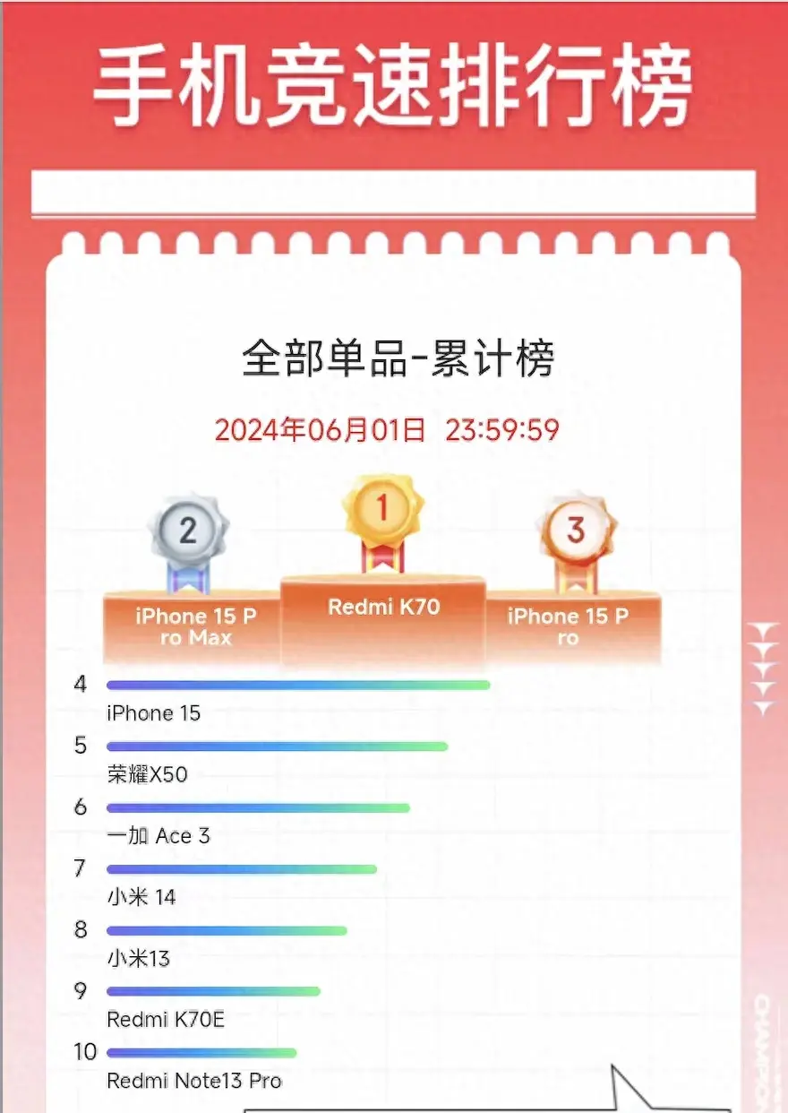 在最近,科技圈傳來一個重磅消息,京東公布了一份競速榜單,小米又一次令人嘆為觀止。數據顯示,小米各款機型表現出色,首先是Redmi K70,直接就是京東618不加定語的銷量冠軍,甚至超越了降價的蘋果,在國產手機里屬于十分罕見的存在。小米的數字旗艦系列小米13和小米14,也紛紛擠進了榜單前十,整體表現讓人嘆為觀止。