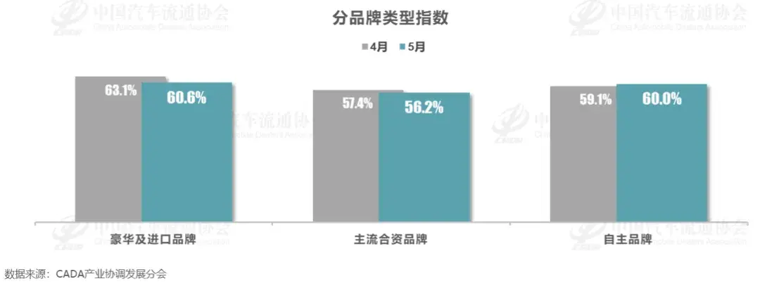 從品牌類型來看,過去5月豪華及進口車、主流合資品牌的庫存指數都有所下降,而自主品牌的整體庫存指數則是小幅增長,來到了60.0%。
