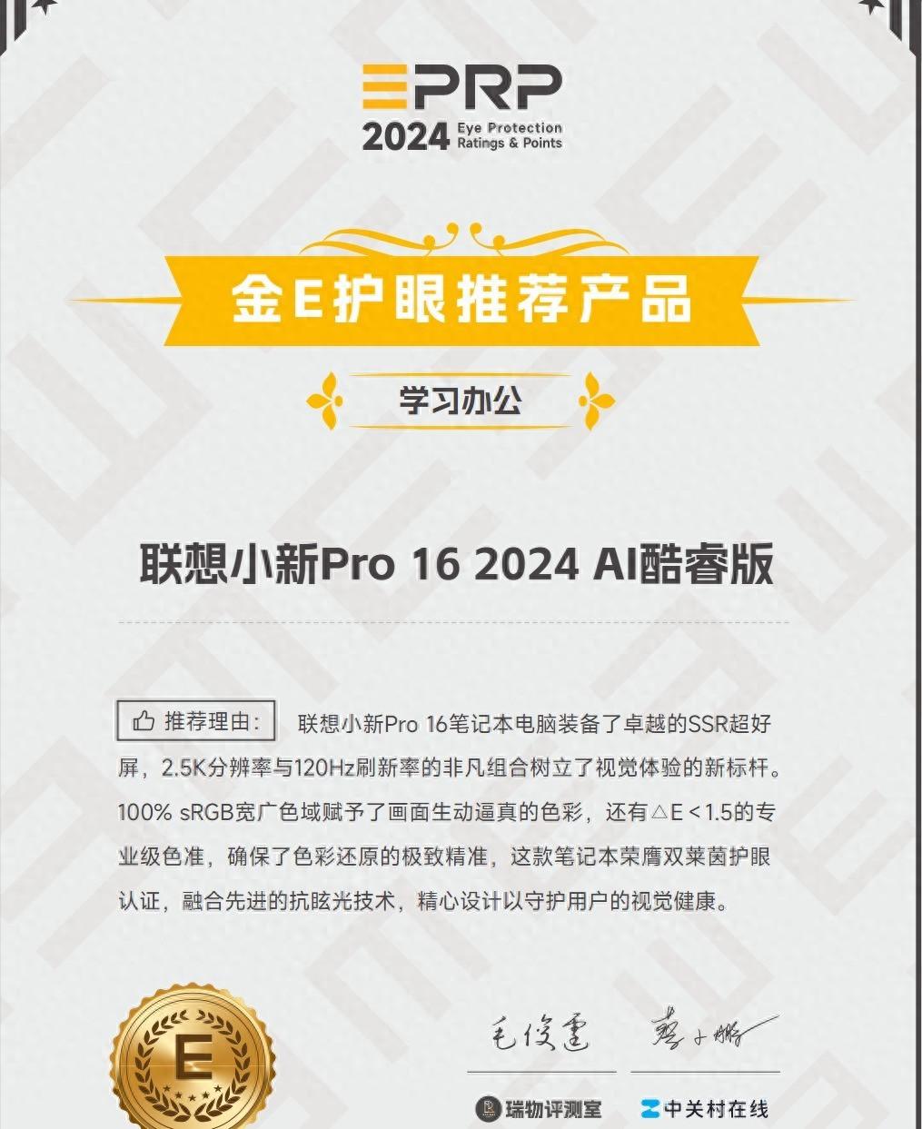 2024 金E護眼-學習辦公護眼推薦產(chǎn)品:聯(lián)想小新Pro 16 2024 AI酷睿版