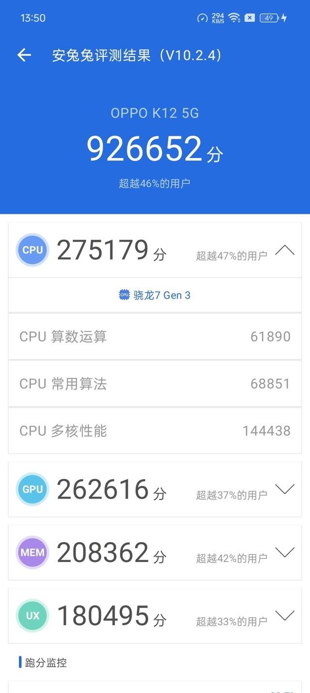 首先是跑分測試,OPPO K12獲得了安兔兔V10測試926652分的成績,符合這款手機的定位。