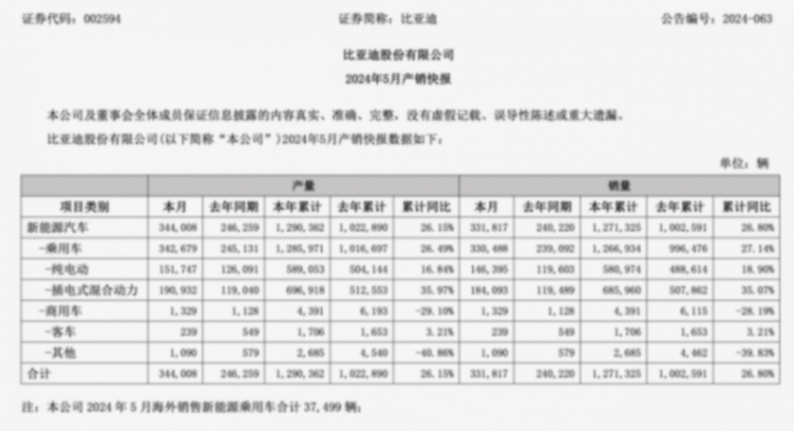 6月2日,比亞迪公告,5月新能源汽車銷量331,817輛,上年同期240,220輛。本年累計銷量1,271,325輛,同比增長26.80%。值得注意的是,4月份,比亞迪新能源汽車銷量313245輛,