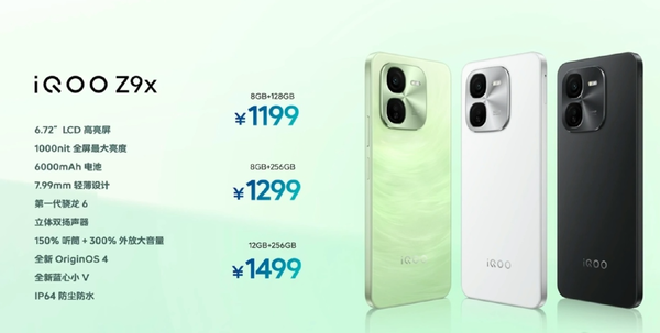 第三款機(jī)型為iQOO Z9x,這款產(chǎn)品搭載了6.72英寸的LCD屏幕,配備6000mAh大電池和驍龍6 Gen 1移動(dòng)平臺,提供三種存儲(chǔ)版本,其中8GB+128GB售價(jià)1149元,8GB+256GB售價(jià)1249元,12GB+256GB售價(jià)1449元。