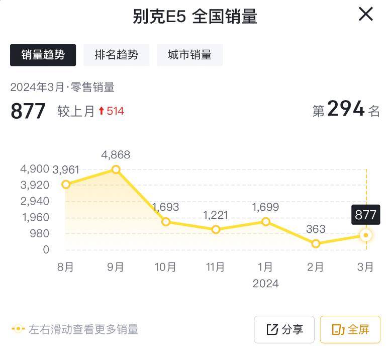 只是,由于2月份銷量基數比較低,所以其單月零售銷量,依然在1000臺以下。顯然,從2023年10月份開始,截止到2024年3月份,在長達半年的時間之中,別克E5的單月零售銷量規模一直在2000臺以下運行。