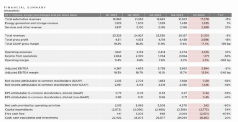 三項(xiàng)業(yè)務(wù)加起來,特斯拉的總收入 213 億美元,同比下滑 9%,是 2020 年新冠疫情以來的首次下滑。