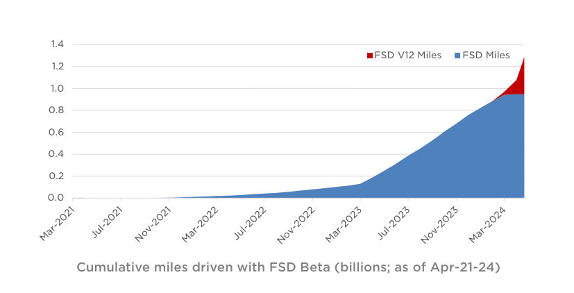自動(dòng)駕駛方面,一季度特斯拉推出了 FSD V12,并推出 30 天免費(fèi)試用活動(dòng),被應(yīng)用到 180 萬輛汽車上,F(xiàn)SD 的累計(jì)里程數(shù)繼續(xù)高增長。FSD 累計(jì)已經(jīng)行駛了 13 億英里,最近 20 天里程數(shù)增加了 3 億英里。