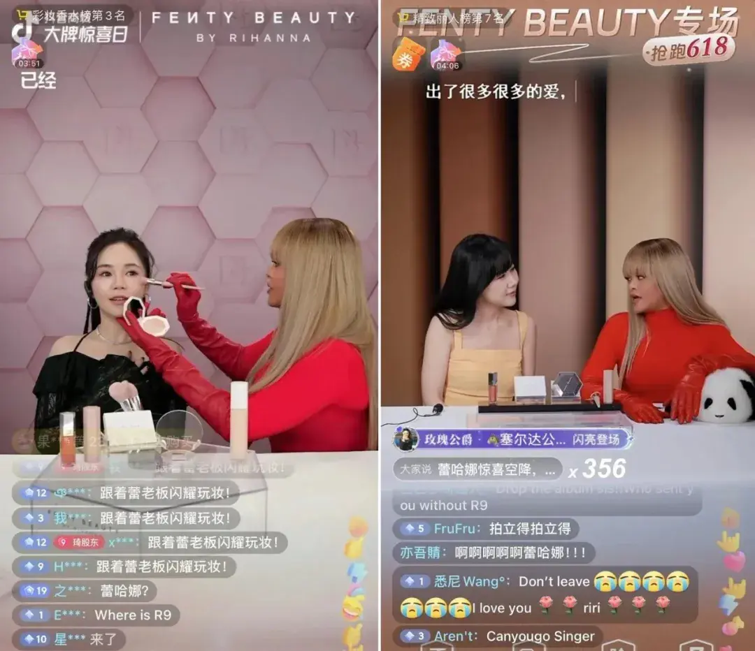 “新老互動”方面,流行天后蕾哈娜與琦兒Leo、深夜徐老師同框直播,直播帶貨自創品牌Fenty Beauty,直播首秀后品牌店鋪新客環比提升140倍。