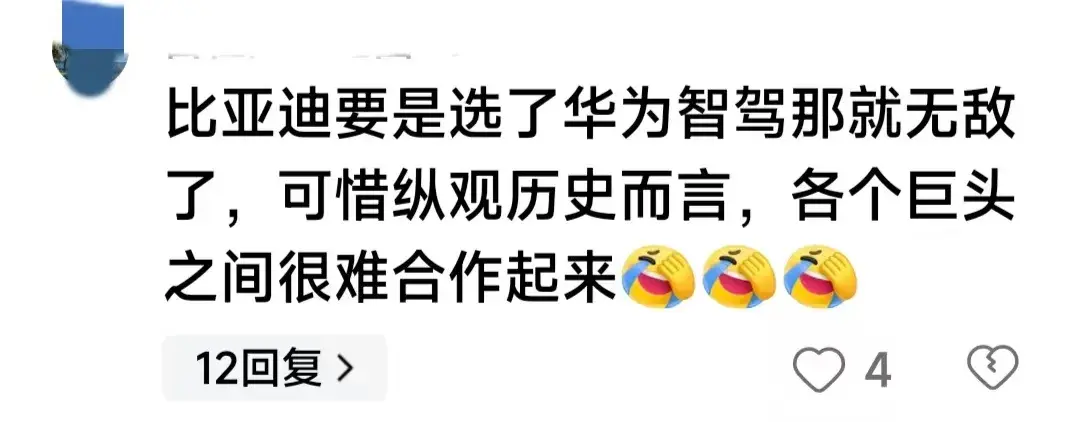 網友三,如果比亞迪能選擇華為智駕那就無敵了,可惜縱觀歷史,巨頭之間很難合作得起來。