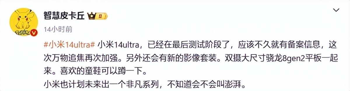 1月15日消息,據(jù)博主“智慧皮卡丘”爆料,小米14 Ultra已經(jīng)進(jìn)入了最后測試階段,不久后就會有備案信息。