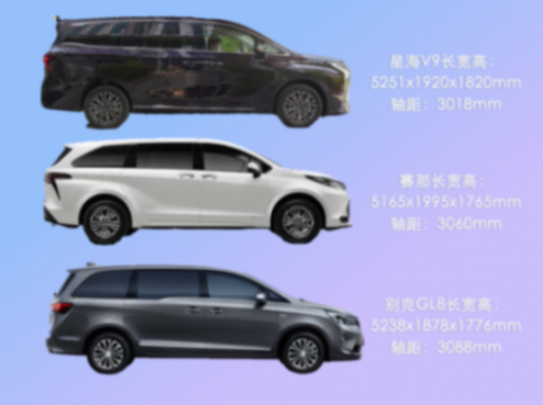要說車身尺寸,身為標(biāo)準(zhǔn)的大7座豪華MPV,星海V9相比同級老牌合資GL8、賽那在車長以及車身高度上更占優(yōu)勢。具體來說,星海V9比賽那尺寸更長,比GL8高度更高,整車長/寬/高分別為5251/1920/1820mm、軸距為3018mm。