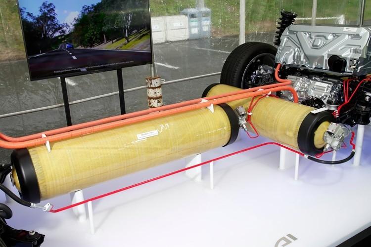 重點是燃料電池模塊,其通過位于后橋的兩個總容量為4.3公斤儲氫罐提供的氫氣,并與空氣的氧氣進行電化學反應產生電力,最大可以為電池&電機提供92.2kW的最大功率輸出。