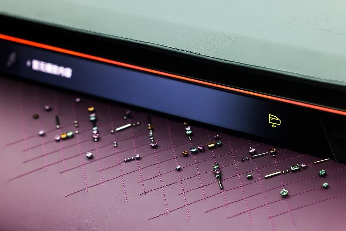 進入座艙,副駕內飾面板上有 42 顆來自斯里蘭卡和緬甸的天然彩藍寶石,均采用皇家切割工藝,奢華璀璨。