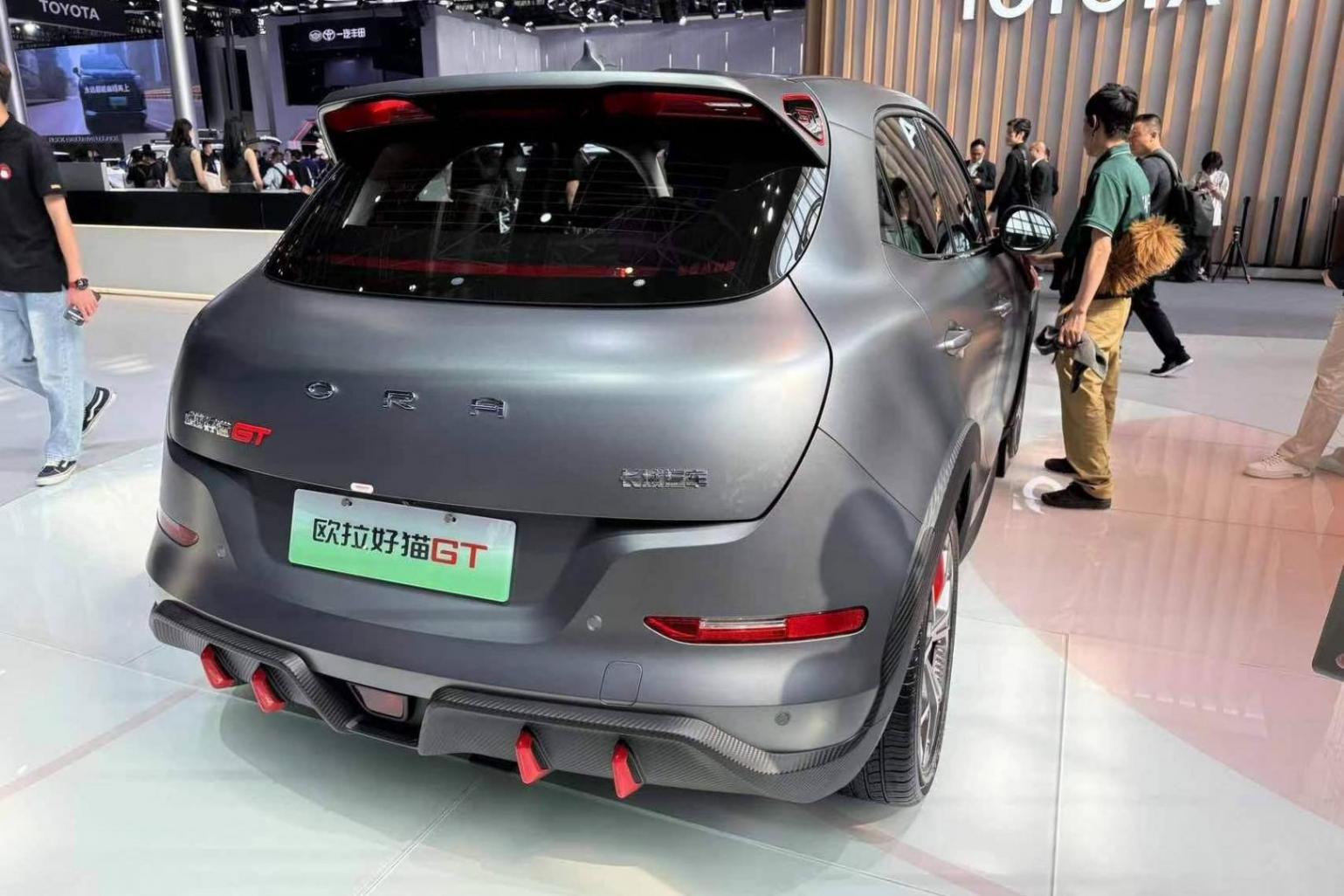 新款歐拉好貓GT的前臉基本沿用現款的造型設計,圓潤的線條搭配橢圓形燈組及三段式進氣口,讓新車看上去十分精致。前機艙蓋上隆起的筋線,適當地提升了該車的運動氣息。新款歐拉好貓GT帶有更明顯的運動化外觀設計,灰色涂裝和紅色細節裝飾的搭配方案則是全新的配色。同時,全新樣式的五輻式輪圈,大大增加了車輛的時尚感。