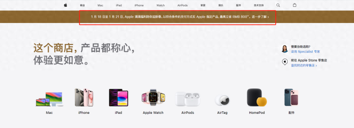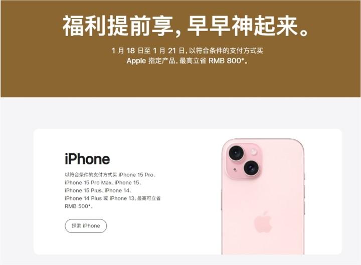 今天(1月15日),蘋果中國官網公布了迎新春限時優惠活動預告,首頁顯示稱1月18日至1月21日,Apple滿滿福利陪你迎新春。以符合條件的支付方式買 Apple 指定產品,最高立省800元。