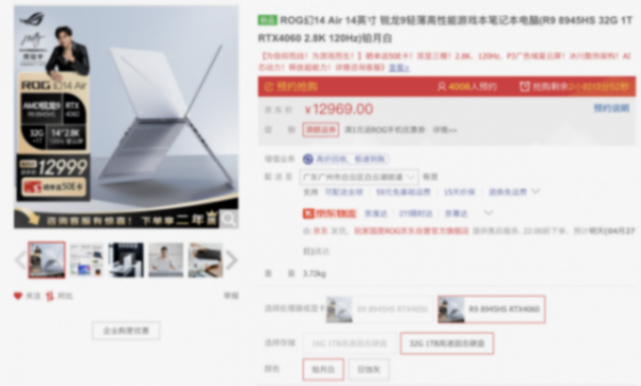 ROG幻 14 Air:AMD R9 8945HS處理器,RTX4060獨顯,32GB內(nèi)存+1TB SSD,2.8K 120Hz ROG星云屏,73Wh大電池,15.9mm薄+1.5kg輕機(jī)身,到手價12969,好評率97%。