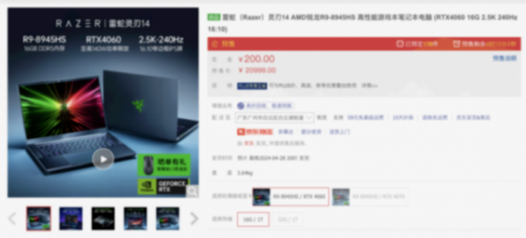雷蛇靈刃14:AMD R9 8945HS處理器,RTX4060獨顯,16GB內(nèi)存+1TB SSD,2.5K 240Hz 電競屏,68.1Wh電池,17.99mm+1.84kg機(jī)身,到手價20999。