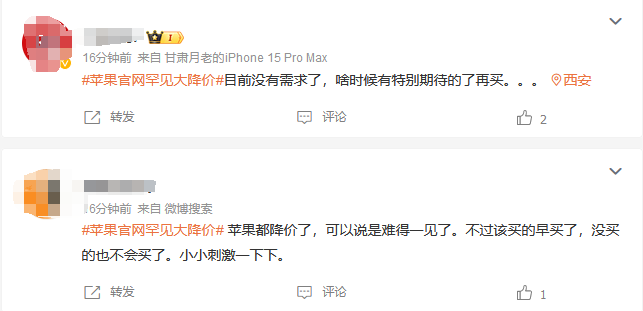 所以也有部分第三方經(jīng)銷商在喊話,“又不是搶首發(fā),這個價格真沒有任何競爭力”。更何況官網(wǎng)這波降價還有限額,還需要搶。也有網(wǎng)友吐槽,蘋果這波的確沒什么誠意、該買的早買了沒買的以后也不會買。