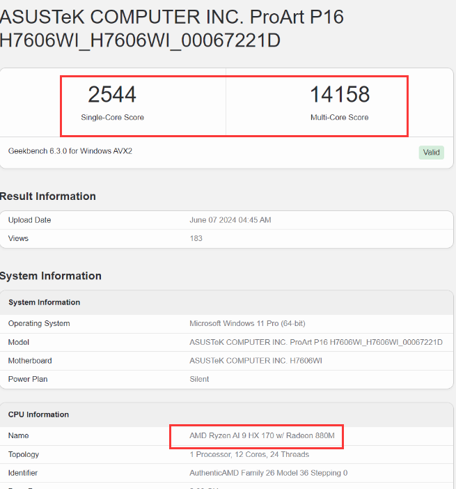 在Geekbench 6平臺上,Ryzen AI 9 HX 370在靜音模式下,單核性能得分為2544分,多核性能為14158分。
