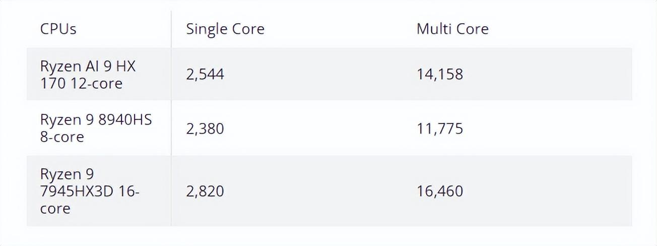 與Ryzen 9 8940HS相比,Ryzen AI 9 HX 370的單核性能和多核性能分別領先6.5%和17%,與Ryzen 9 7945HX3D相比,Ryzen AI 9 HX 370單核性能低11%,多核性能低16.2%。