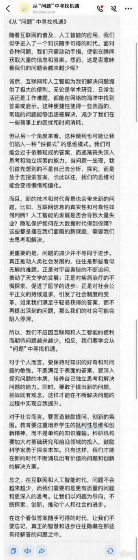 豆包寫的作文有900+字,以“學會從問題中找機遇,敢于提問、鼓勵探索未知”為主題,通篇文風很沉穩,嚴謹論證,沒有用一些浮華的辭藻,信息密度較高,并在結尾用“看似答案隨手可得”、“真正的智慧和進步往往隱藏在那些有待解答的問題之中”再度扣題。