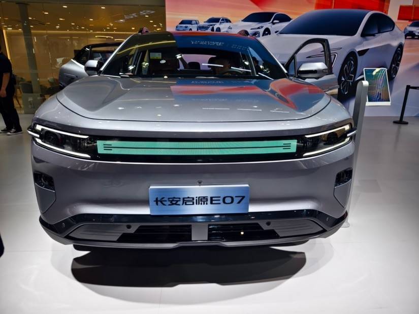 從外觀設(shè)計(jì)來(lái)看,長(zhǎng)安啟源E07主打一個(gè)“不走尋常路”。如果說(shuō)封閉式前臉在新能源車中還算常見,那么可顯示信息的貫穿式燈組,再搭配發(fā)光logo,觀感還是很科幻的。視角來(lái)到側(cè)面就能一眼發(fā)現(xiàn)它的差異化,車頂最高點(diǎn)位于A柱上方,隨后用大溜背線條延伸至車尾,再搭配21英寸大輪轂,視覺(jué)沖擊力極強(qiáng)。