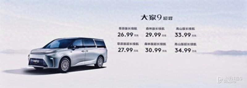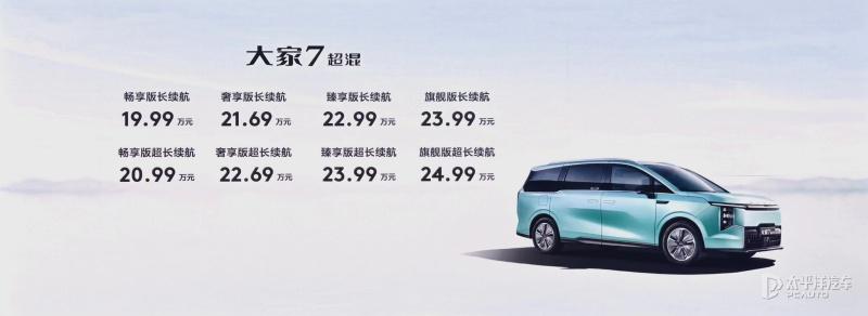 新車頻道】6月7日,上汽大通旗下的新能源MPV車型大家7和大家9(詢底價|查參配)迎來了各自的超混車型——大家7超混版/大家9超混版。其中,大家9超混版共推出長續航和超長續航車型,共6個子車型,官方指導價格26.99-34.99萬元。大家7超混版同樣推出了兩種續航里程車型,共8個子車型,官方指導價19.99-24.99萬元。具體各車型價格請看下圖: