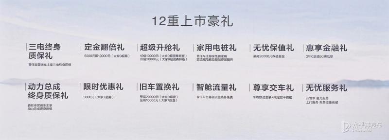 與此同時,新車的上市購買權益也公布出來,共有12個相關權益。其中包含了三電終身質保,大家9超混5000定金抵10000元,超級升艙禮,2年0息或60期低息以及動力總成終身質保等。具體權益參看下圖: