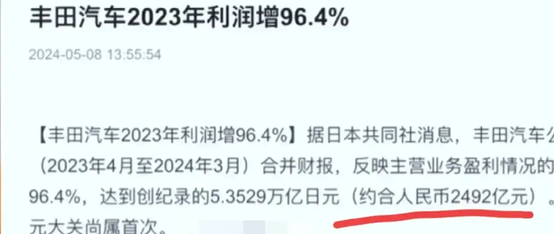 而正是憑借著自己在這兩個領域的領先技術,豐田才能夠在這個新能源汽車的浪潮下保持著如此亮眼的表現,2023年的財報中,豐田的凈利潤更是達到了2492億,這個數字不僅是其他車企望塵莫及的,甚至還超過了東方大國的18家車企的總利潤,可謂是非常的驚人。