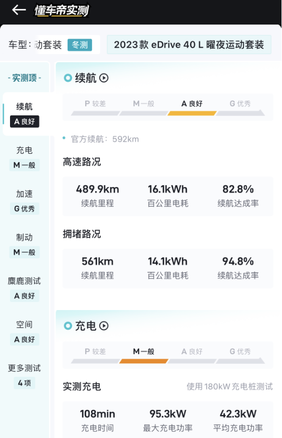 此車在實測的成績當中表現較好,它的續航能力最為出色,續航達成率80.2%,在高速的路況下,在擁堵路況下續航達成率94%,夏季實測續航達成率74.4%,而且充電表現較為優越。