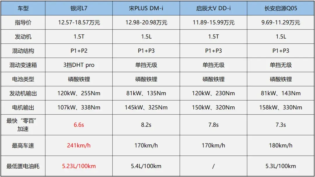 將銀河L7和L6與同級別的單擋插混車型進行對比不難發現,這兩款車的發動機輸出是最強的,零百加速是最快的,而且匱電狀態下的油耗也是最低的,這說明雷神混動8848的有著更高的系統效率,動力和能效都超越單擋插混系統。