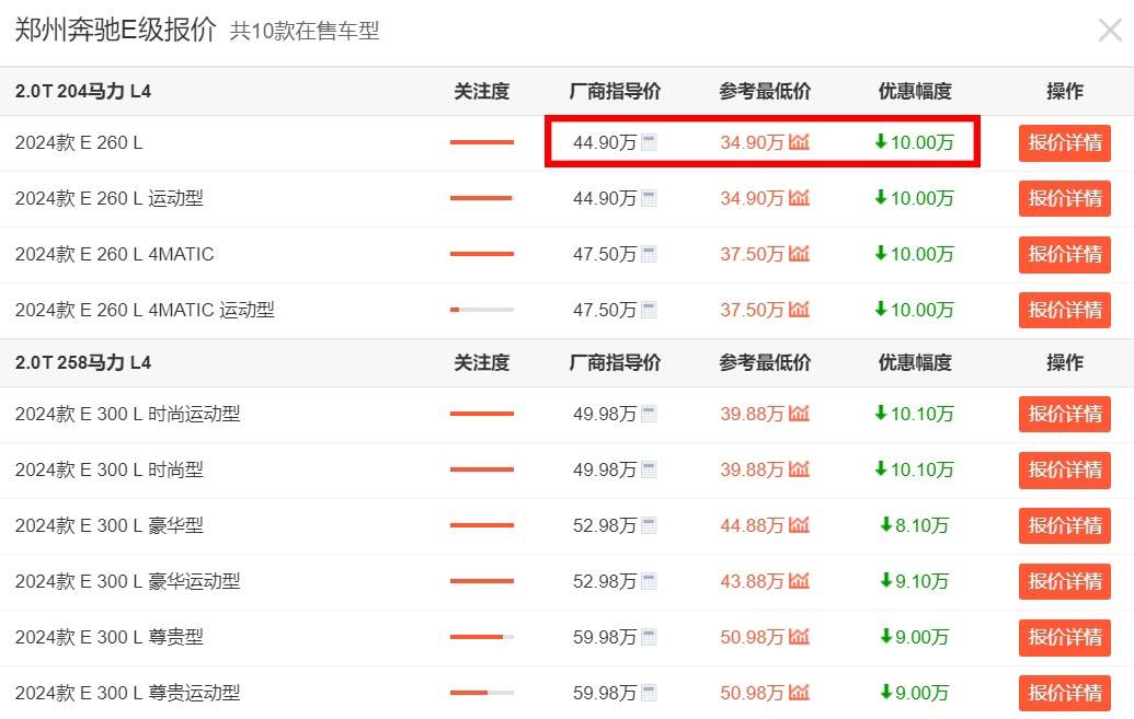 具體來看,目前奔馳E級在鄭州、北京、唐山、無錫、許昌以及蘇州地區都擁有9-10萬元左右的優惠,其中,鄭州地區的奔馳E級車型優惠最高,達到了10.10萬元。我們以原價44.90萬元的奔馳E級 2024款 E260L車型為例,新車優惠完之后的參考最低價已經來到了34.90萬元,整體優惠降幅還是蠻大的。