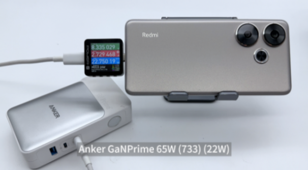 Anker GaNPrime 65W (733) 為Redmi Turbo 3充電,使用POWER-Z KM003C測得充電功率為8.34V 2.73A 22.75W。