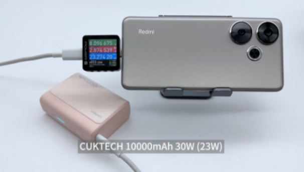 CUKTECH 10000mAh 30W 為Redmi Turbo 3充電,使用POWER-Z KM003C測得充電功率為8.10V 2.87A 23.27W。