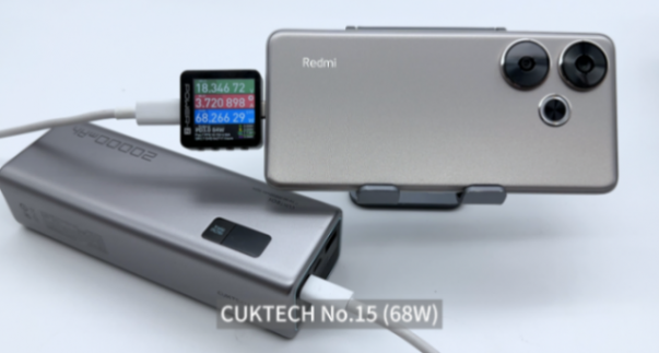 CUKTECH No.15 為Redmi Turbo 3充電,使用POWER-Z KM003C測得充電功率為18.35V 3.72A 68.27W。