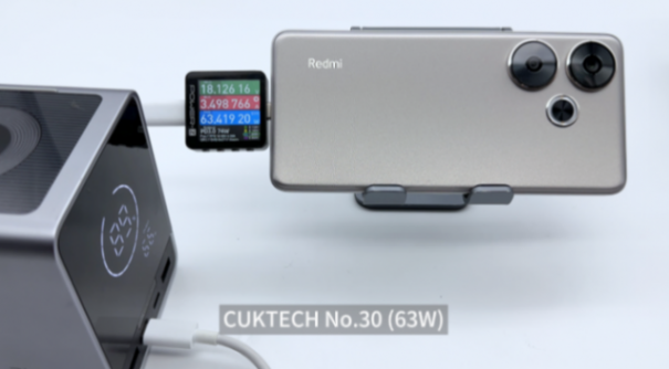 CUKTECH No.30 為Redmi Turbo 3充電,使用POWER-Z KM003C測得充電功率為18.13V 3.50A 63.42W。